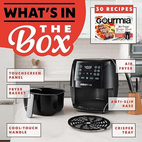 Introducing the Gourmia GAF686 Digital Air Fryer – your new go-to for quick, healthy meals. This top-rated 6-quart air fryer features smart touchscreen controls, 12 one-touch presets, and FryForce 360° airflow for perfectly crispy results with up to 80% less fat—all without deep-frying.